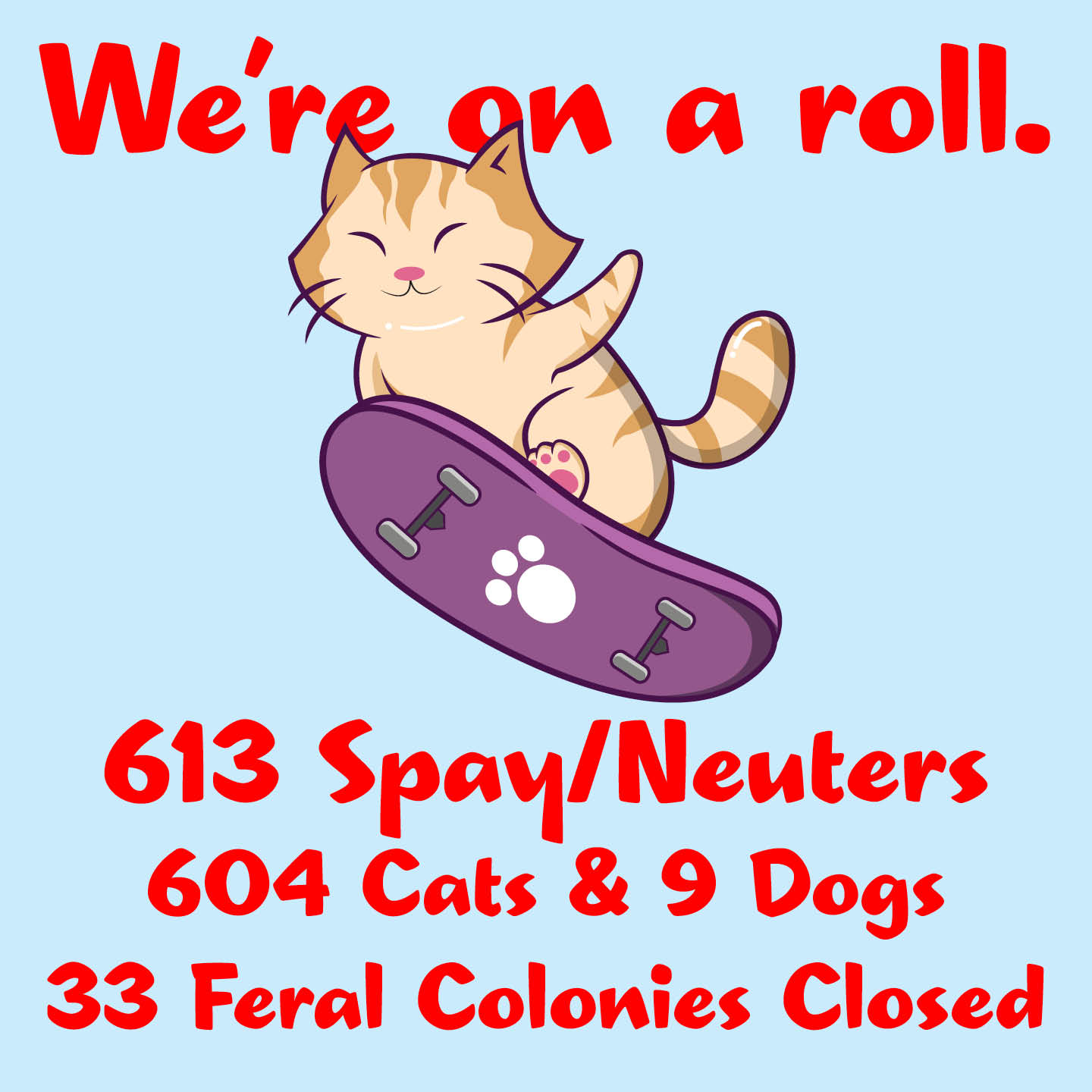 Thanks to your support, we’ve accomplished 613 spay/neuter surgeries—604 cats and 9 dogs—helping to reduce pet overpopulation and improve the lives of countless animals.Even more exciting, we’ve successfully closed 33 feral cat colonies, preventing future generations of homeless kittens and making a lasting impact on our community.